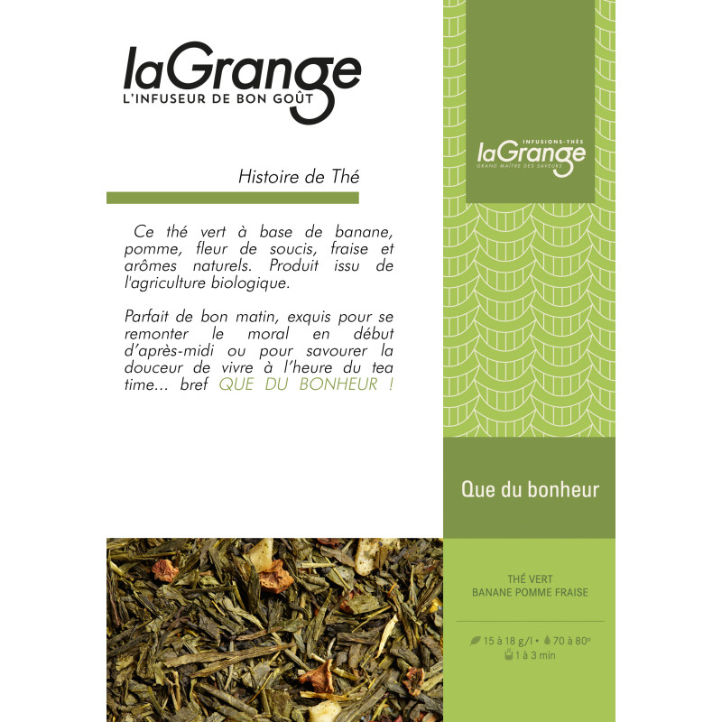Ce thé vert à base de banane, pomme, fleur de soucis, fraise et arômes naturels.