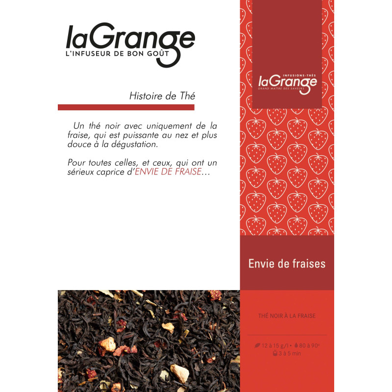 Un thé noir avec uniquement de la fraise, qui est puissante au nez et plus douce à la dégustation.