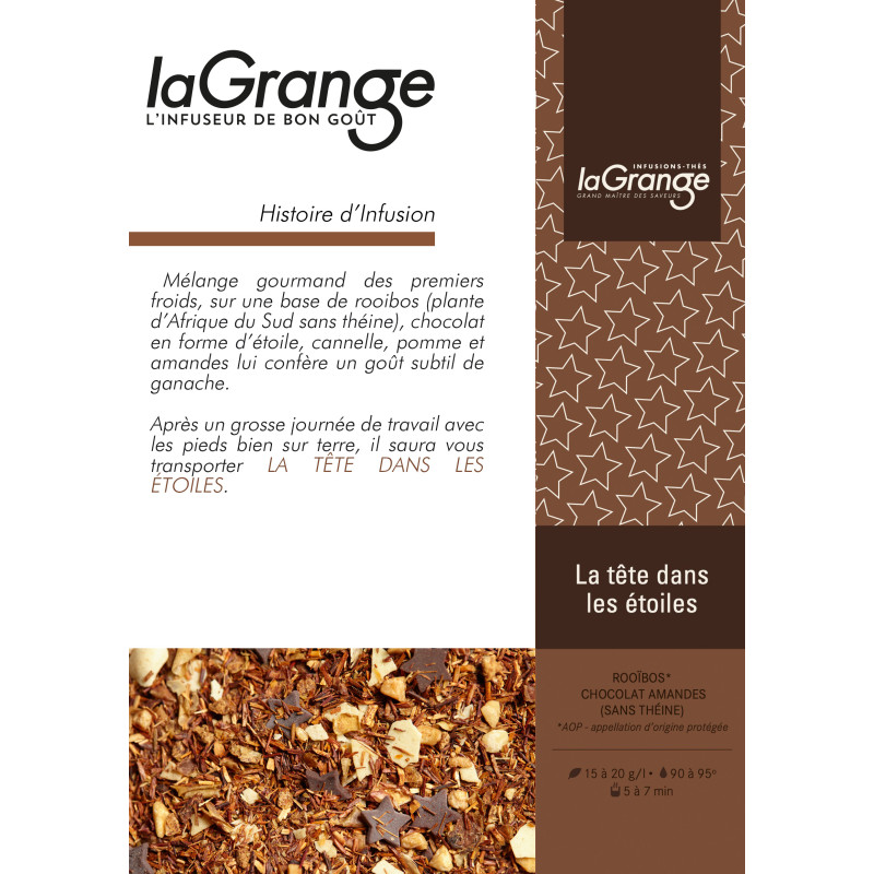 Mélange gourmand des premiers froids, sur une base de rooibos (plante d’Afrique du Sud sans théine), chocolat en forme d’étoile, cannelle, pomme et amandes lui confère un goût subtil de ganache.