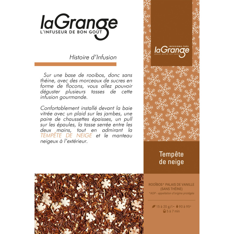 Sur une base de rooibos, donc sans théine, avec des morceaux de sucre en forme de flocons, vous pouvez déguster plusieurs tasses de cette infusion gourmande.
